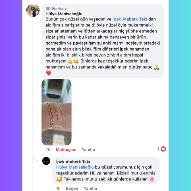 İpek hanım takılarım elime ulaştı ve çok beğendim. Aldığım hizmetten ve ürünlerden çok memnun kaldım teşekkürler